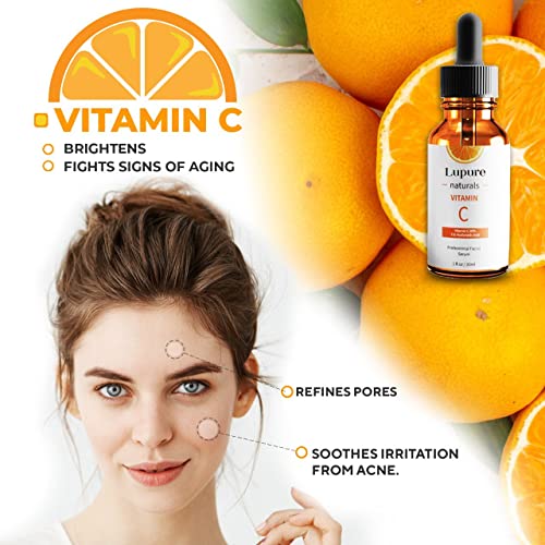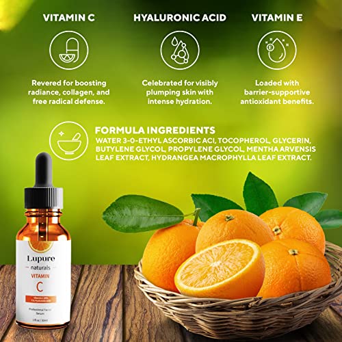 Vitamin C Face Serum with Hyaluronic Acid: Lupure Skin Brightening Serum with Vitamin C and E for Dark Spots – Anti Aging Facial Serum (1 Fl Oz/ 30ml)